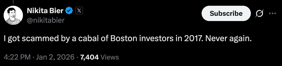 Look, the piece is a little dramatic. Boston is still a top 2-5 tech ecosystem in pretty much any category. I won’t weigh in on MA tax law, and it should go without saying that bad behavior by VCs is bad (and not unique to Boston).1 This piece is also focused on the software ecosystem, and it’s worth noting that the culture is different in biotech, hardware, deeptech, crypto, and so on.