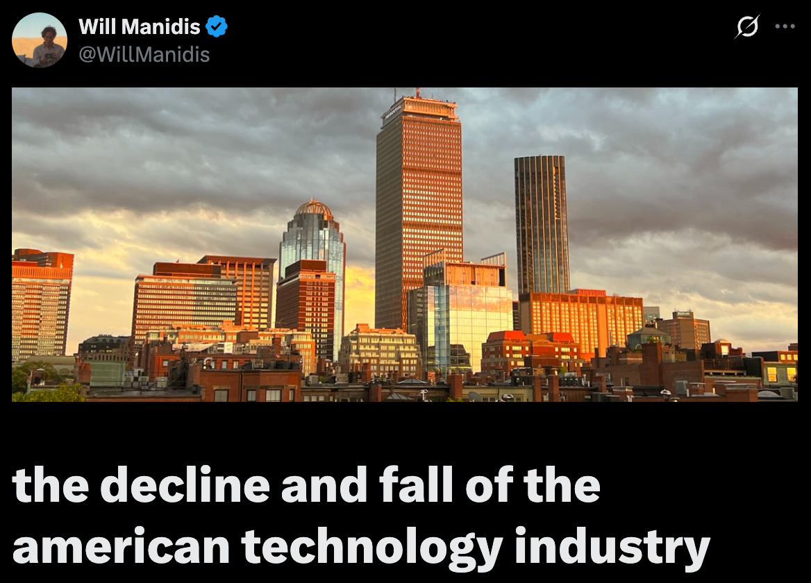 There’s an article making the rounds called the decline and fall of the american technology industry. The author is Will Manidis, a startup founder and angel investor who founded his company ScienceIO in Boston, reluctantly moved it to New York (“I would love to move back and not deal with New York”), and sold it for $140mm in 2024. The piece highlights Boston as an example to warn the tech industry that short-term thinking can cause ecosystems to collapse.